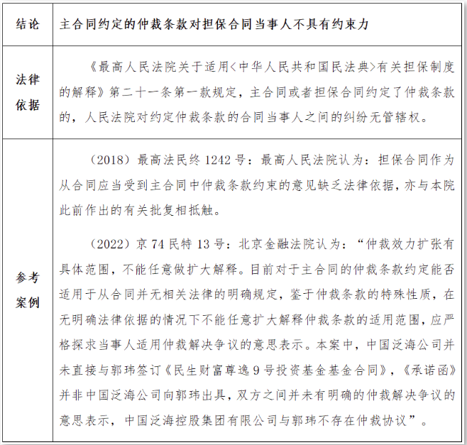例如,主合同约定了仲裁条款、担保合同未约定争议解决条款,或主合同约定了仲裁条款、担保合同约定通过诉讼方式解决争议,那么仲裁条款能否约束担保人?
