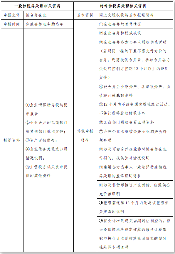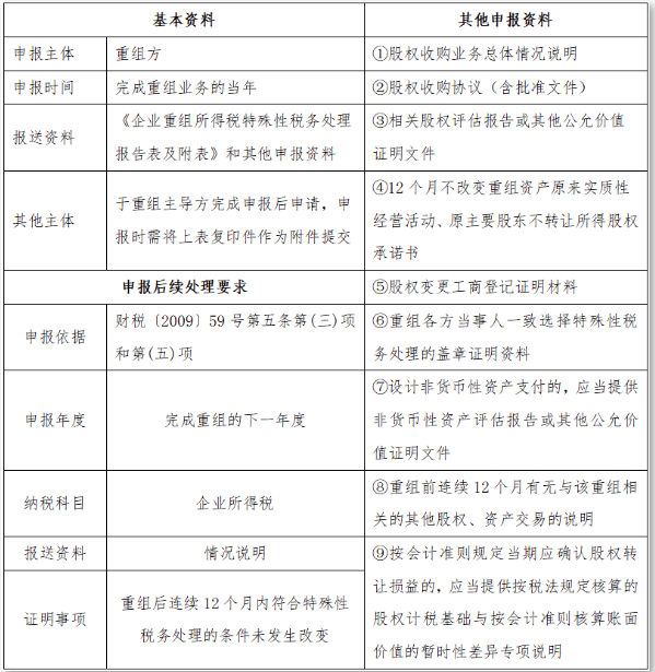 资产收购的特殊性税务处理条件同股权收购适用条件;申报资料中的基础申报资料同股权收购申报资料,其他申报资料中,在与股权收购申报资料相同的基础上增加:被收购资产原计税基础的证明。